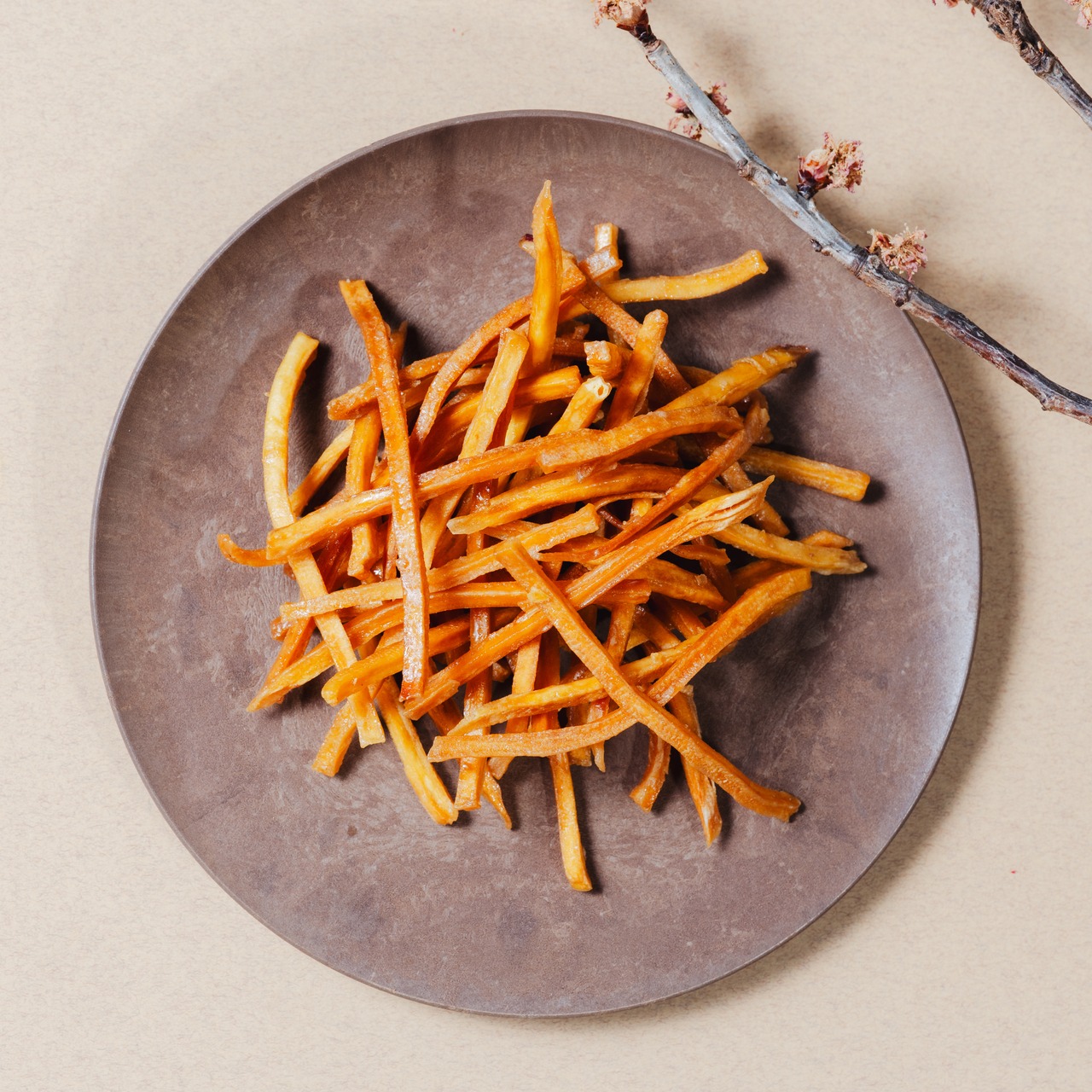 細くてカリカリとした、芋けんぴでどの年代のお客様にも愛される味わいです。また、程よい塩気が甘さを引き立てており、食べ始めると止まらなくなる一品です。